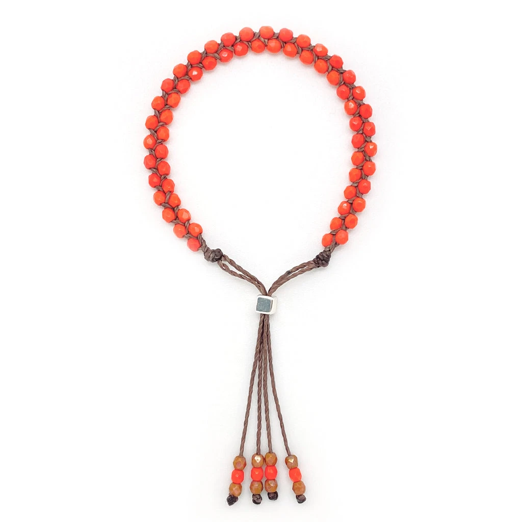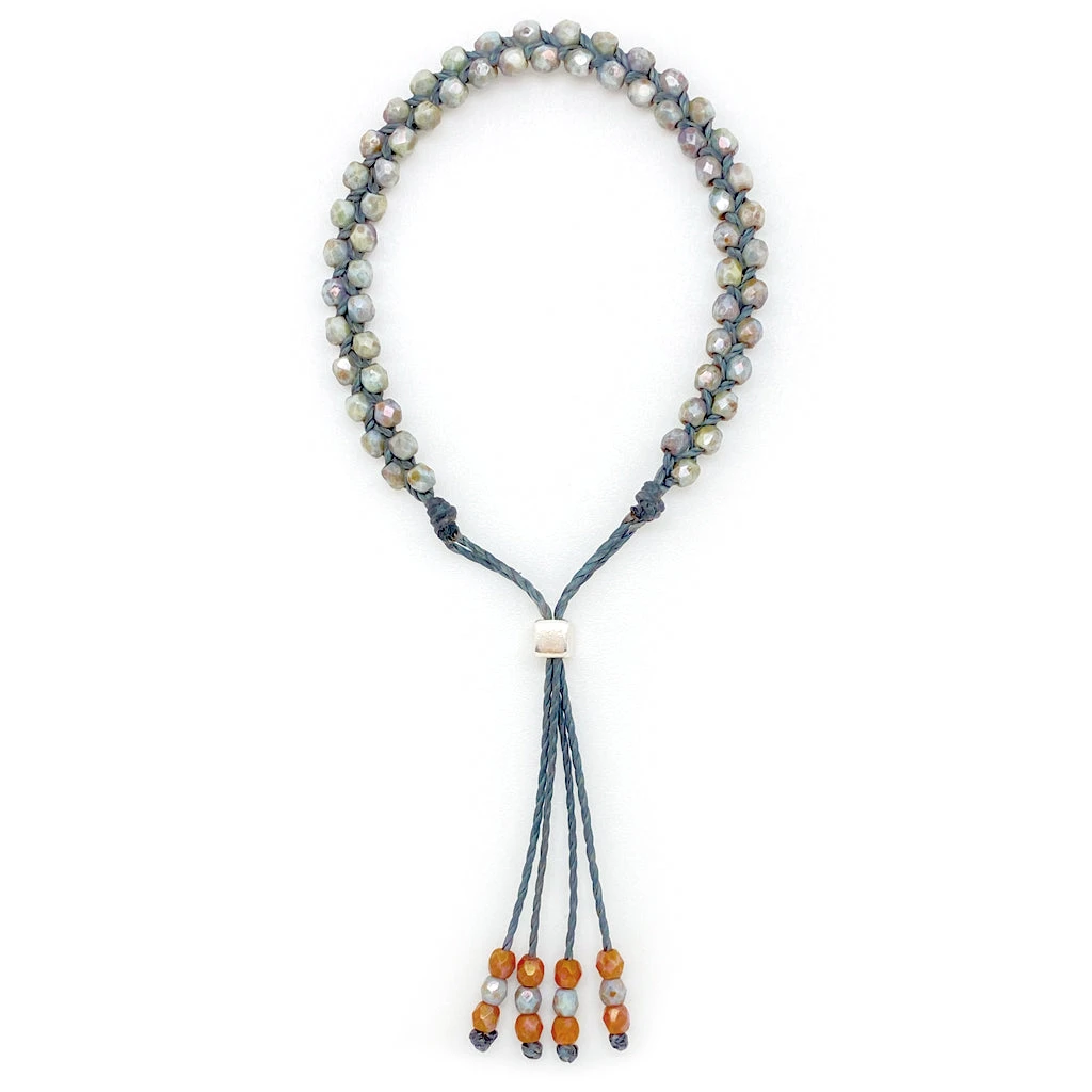 Faceted Czech glass beads are tightly woven into a very durable and waterproof cording with decorative tassel detail. Full adjustable with metal bead cinch closure. Dainty and super strong and water friendly. Made in USA.